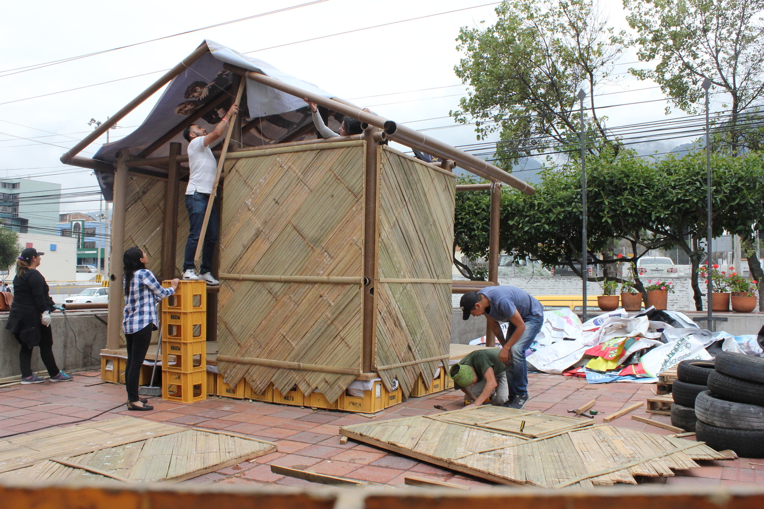 Bamboo është një material shumë i gjithanshëm dhe jashtëzakonisht rezistent ndaj kompresimit dhe lakimit. Një tjetër pasuri e madhe është disponueshmëria e tij në shumicën e pjesëve të botës (veçanërisht në klimat e nxehta) dhe rritja e shpejtë e tij. Prandaj, bambu është ideal për ambiente të përkohshme, si korniza strukturore, por edhe për mure dhe çati. Kur ndërtoni strehimore urgjente, ajo ofron përfitimet e shtuara të montimit të shpejtë dhe mundësinë e mbajtjes në vend për strehim të përhershëm. Sidoqoftë, është e rëndësishme që bambu të konsiderohet një material ndërtimor me qëndrueshmëri të duhur dhe karakteristika të jashtëzakonshme mekanike, kërkohet një trajtim kimik përpara përdorimit të tij në ndërtim, për të shmangur kalbjen dhe infektimin e insekteve. Një shqetësim tjetër i madh për ndërtimin e bambuve është se përbërësit duhet të mbrohen shumë mirë nga dielli dhe shiu.