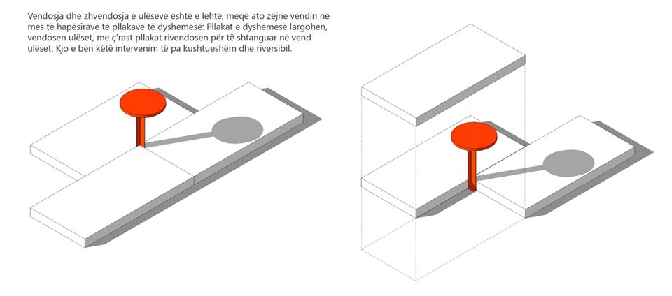 “Vendosja dhe zhvendosja e ulëseve është e lehtë, meqë ato zënë vendin në mes të hapësirave të pllakave të dyshemesë: Pllakat e dyshemesë largohen, vendosen ulëset, me ç’rast pllakat rivendosen për të shtanguar në vend ulëset. Kjo e bën këtë intervenim të pa kushtueshëm dhe riversibil (të kthyeshëm)”, ka shtuar Beqiri.