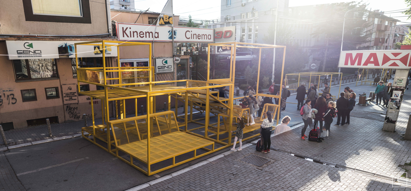 Pavijoni i verdhë është vendosur në rrugë afër kinemasë, në mënyrë që të tërheqë vizualisht këmbësorët, duke i dhënë rrugës një karakteristikë që është vizualisht e pranishme dhe ftuese. Qëllimi kryesor i pavijonit do të jetë lidhja e rrugës me bulevardin në dy dimensione thelbësore.