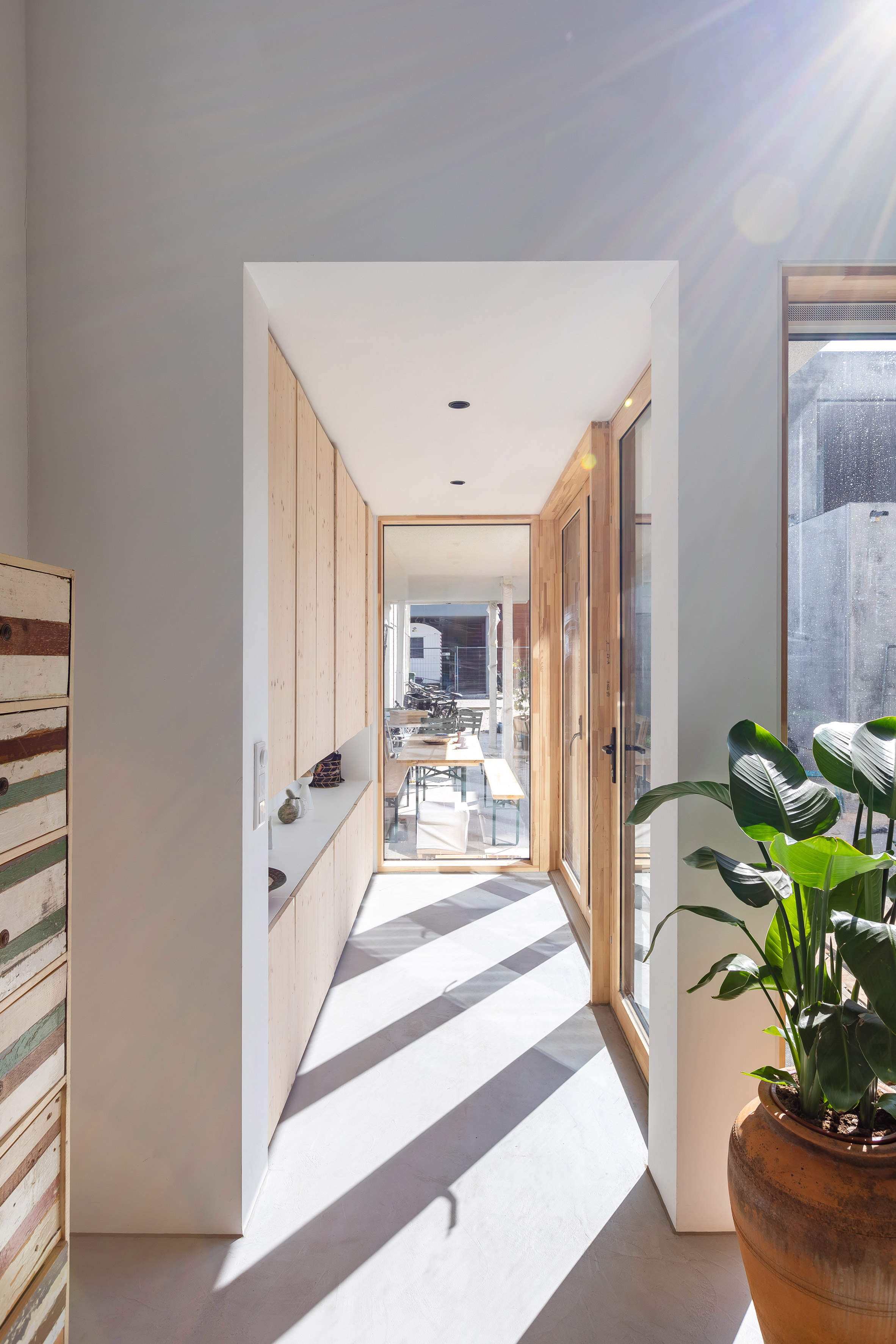 Muret e bardha, dyshemetë prej betoni dhe një kornizë çeliku për shkallët maksimizojnë sensin e hapjes dhe dritës në ambientet e brendshme.
