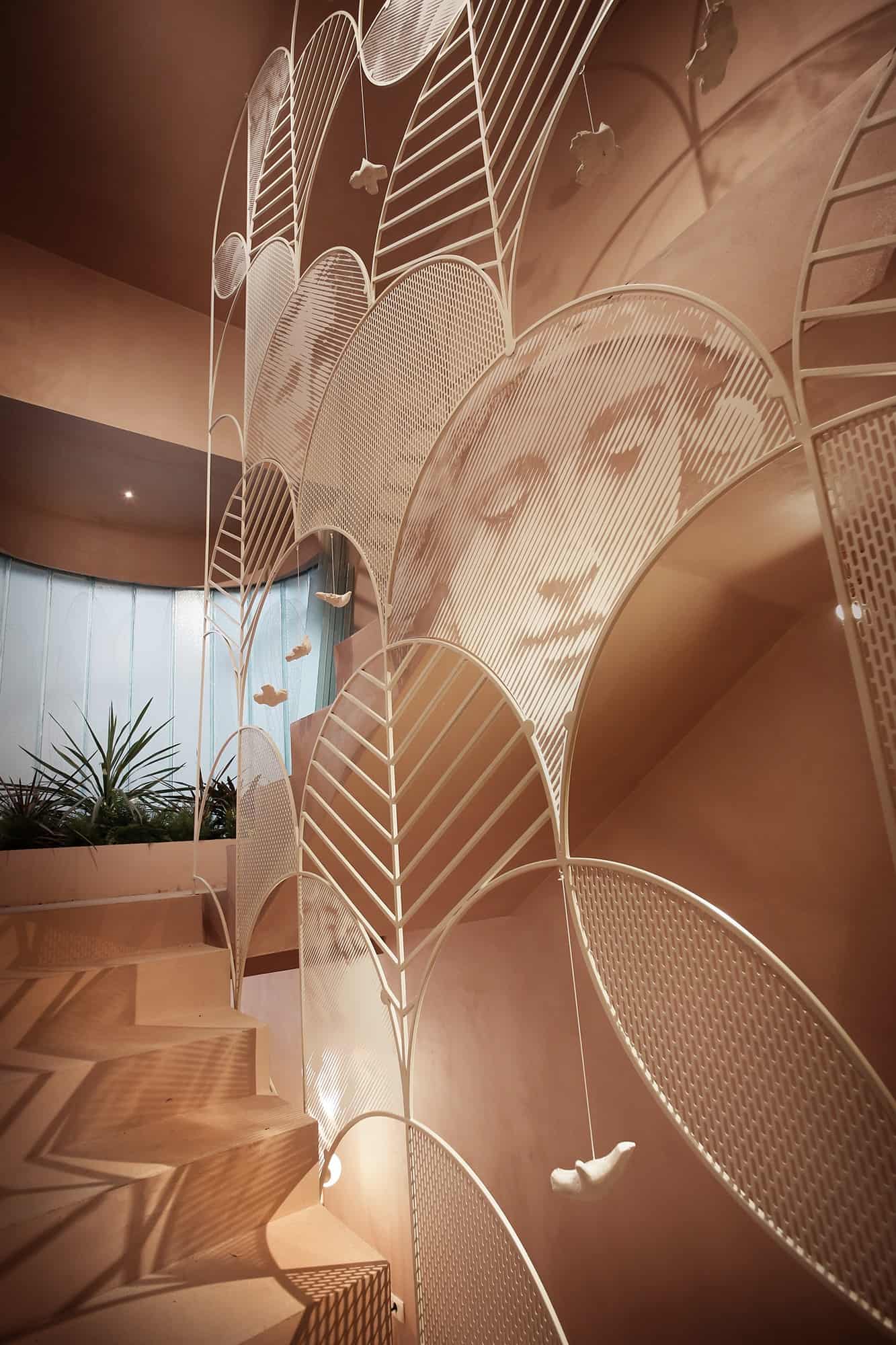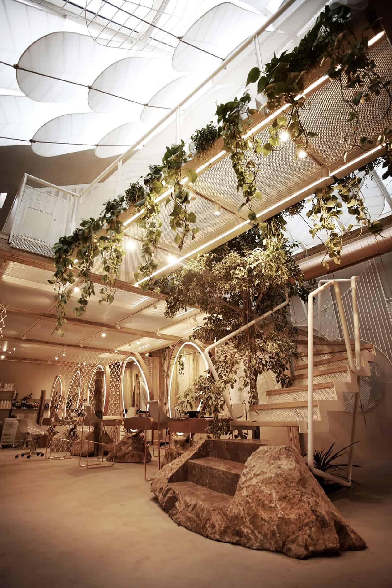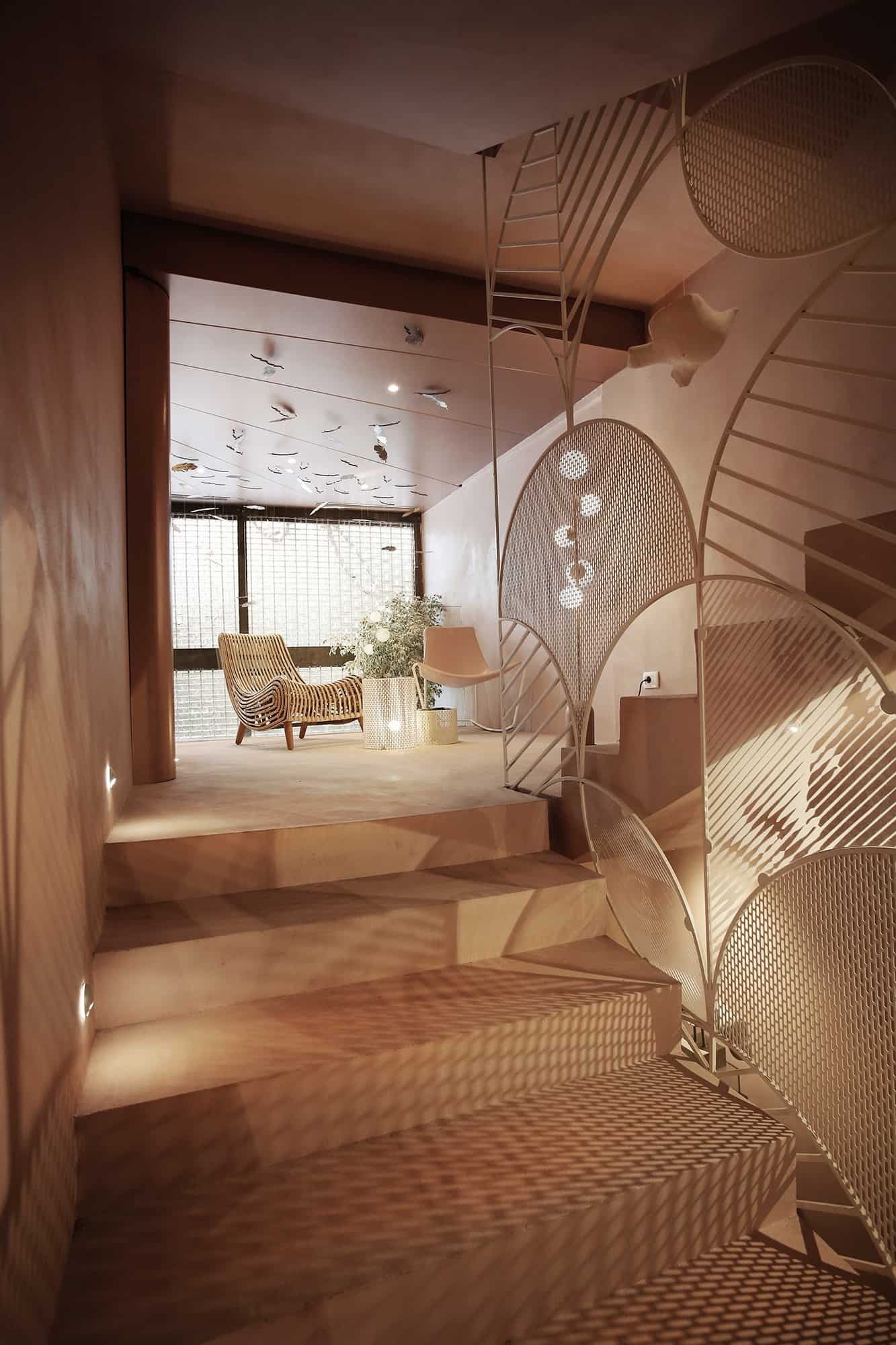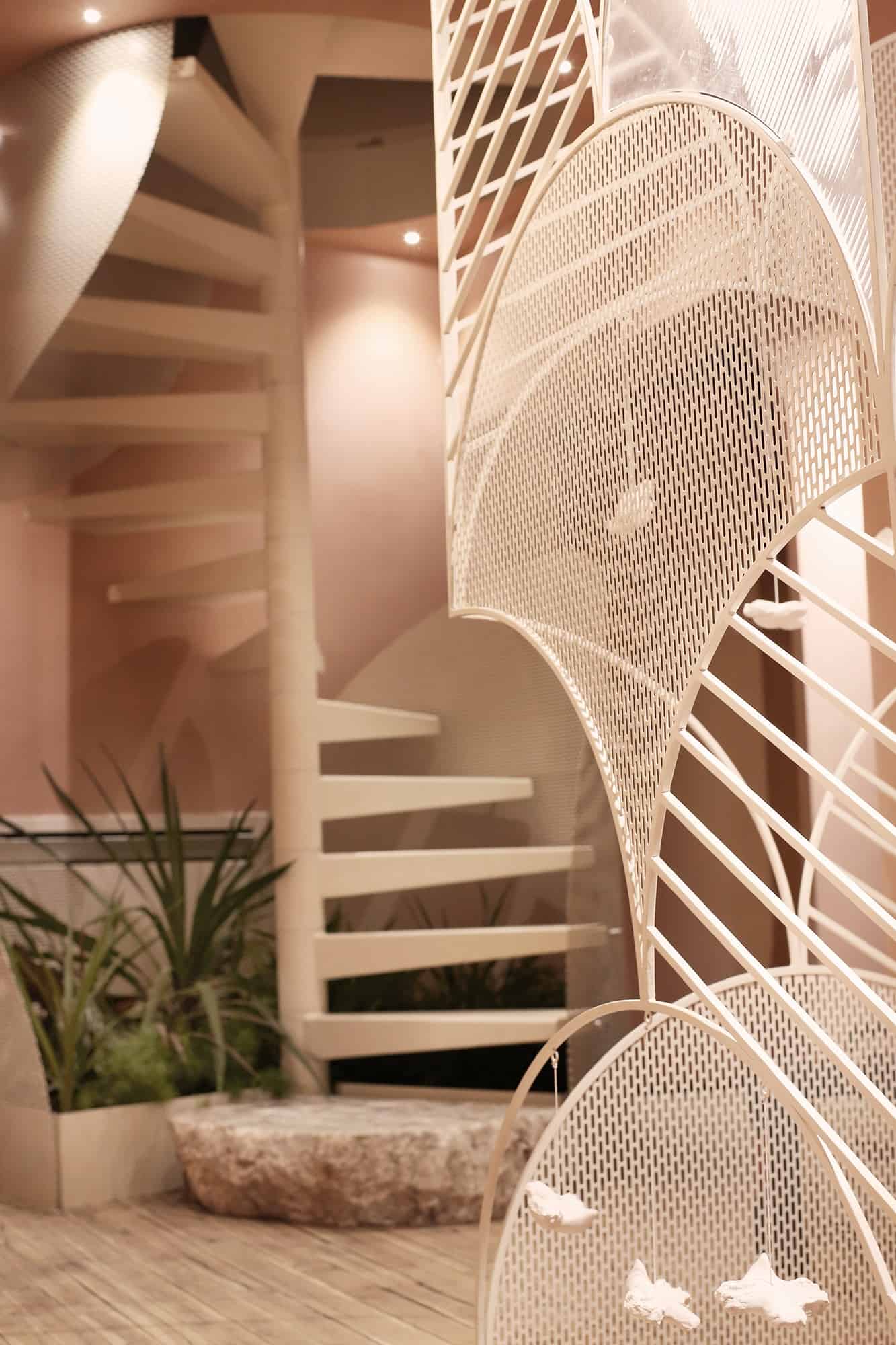Hapësira e cila i është kushtuar flokëve, është e ndarë nga një “mur” i bërë me porosi nga gërshërë metali me ngjyrë të bardhë. Ndërsa shkallët që ndodhe në këtë hapësirë, janë ndërtuar rreth një peme. Tri shkallët e para janë të krijuara nga një gur natyral ndërsa vazhdimi i tyre është ndërtuar nga druri dhe metali me ngjyrë të bardhë.