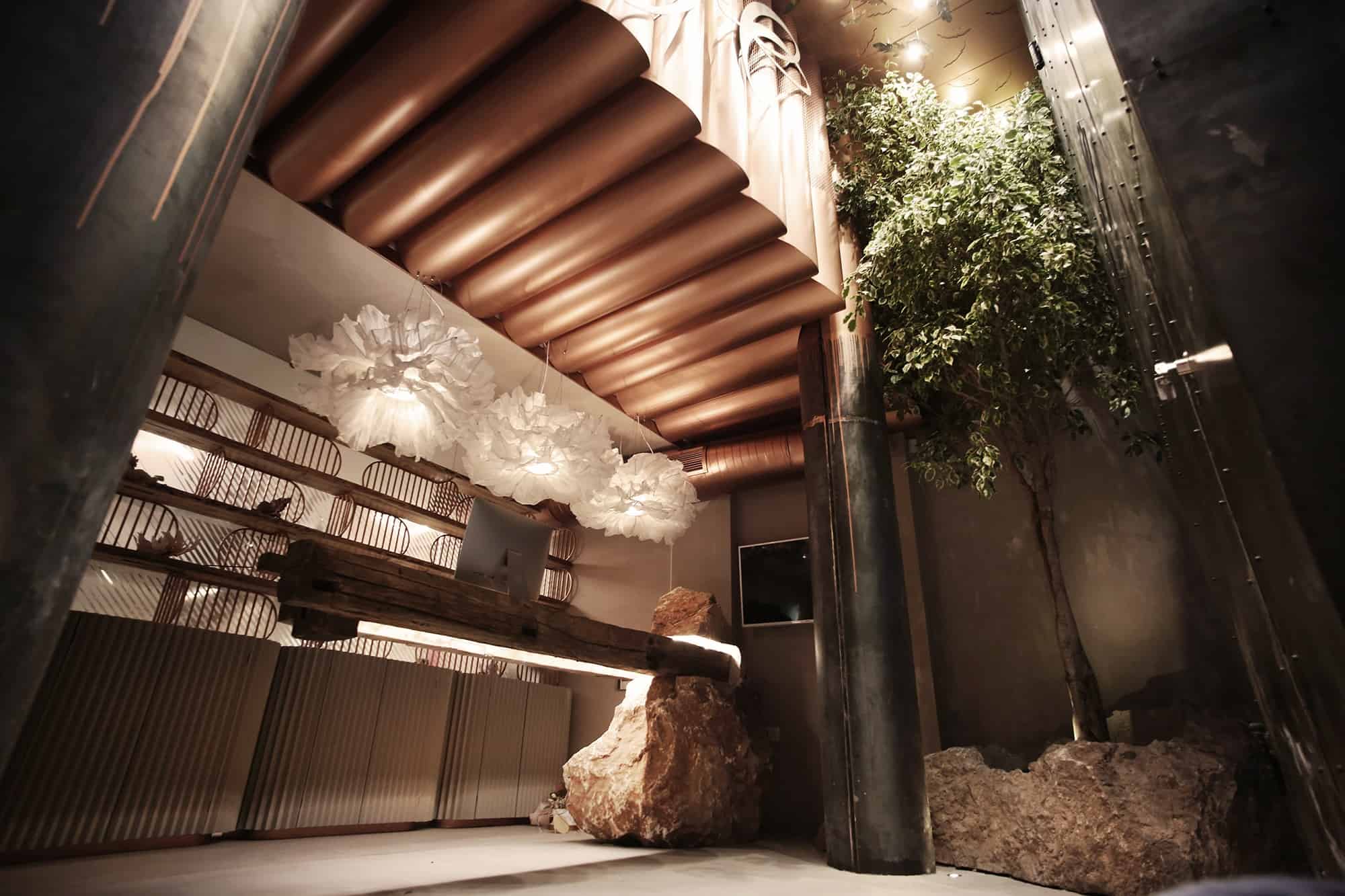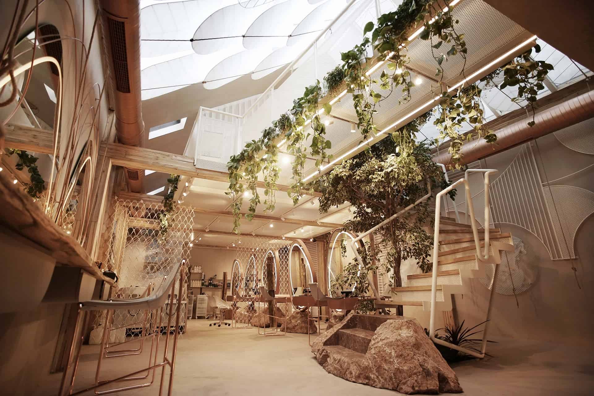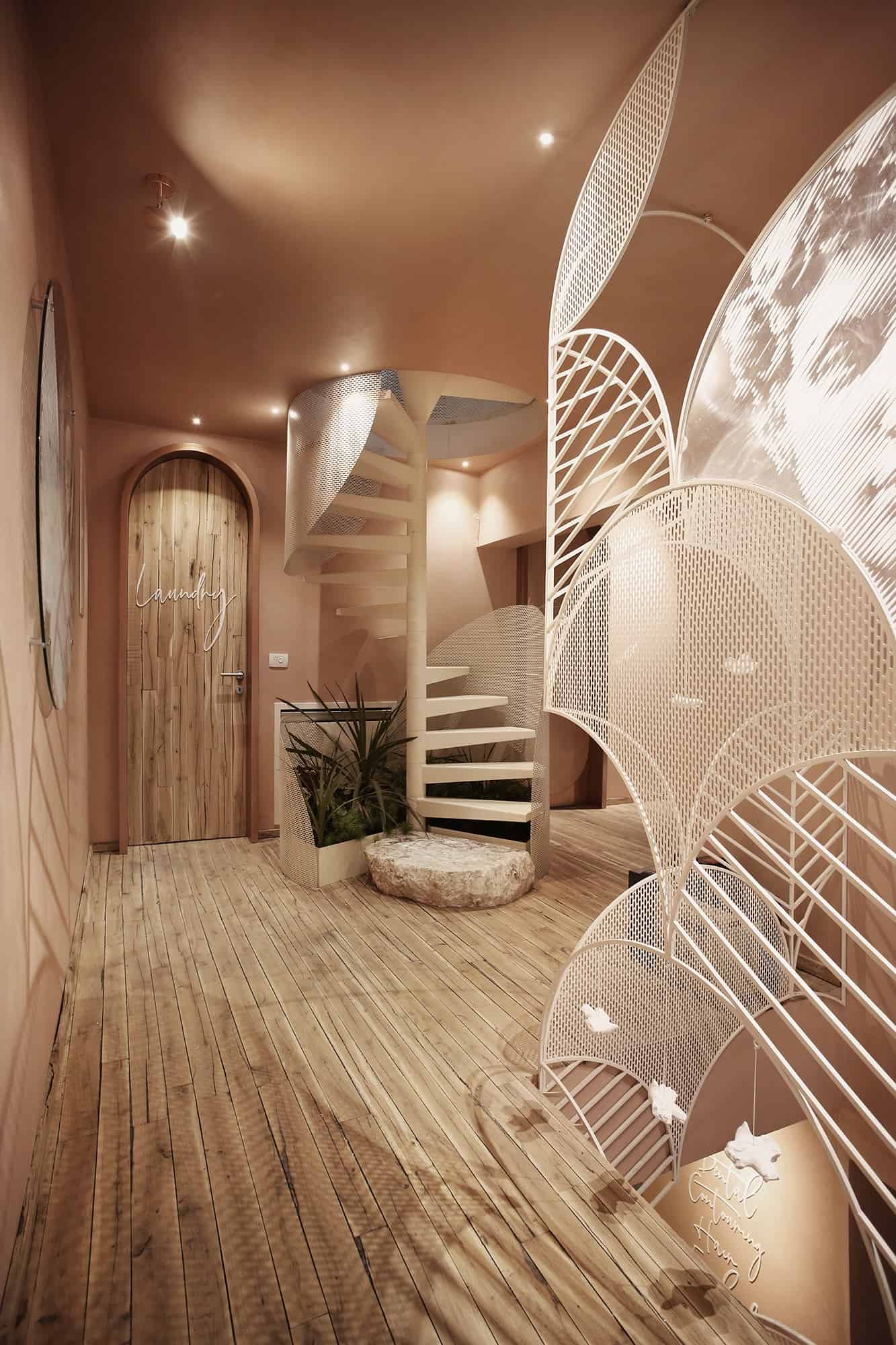 Hapësira e cila i është kushtuar flokëve, është e ndarë nga një “mur” i bërë me porosi nga gërshërë metali me ngjyrë të bardhë. Ndërsa shkallët që ndodhe në këtë hapësirë, janë ndërtuar rreth një peme. Tri shkallët e para janë të krijuara nga një gur natyral ndërsa vazhdimi i tyre është ndërtuar nga druri dhe metali me ngjyrë të bardhë.
