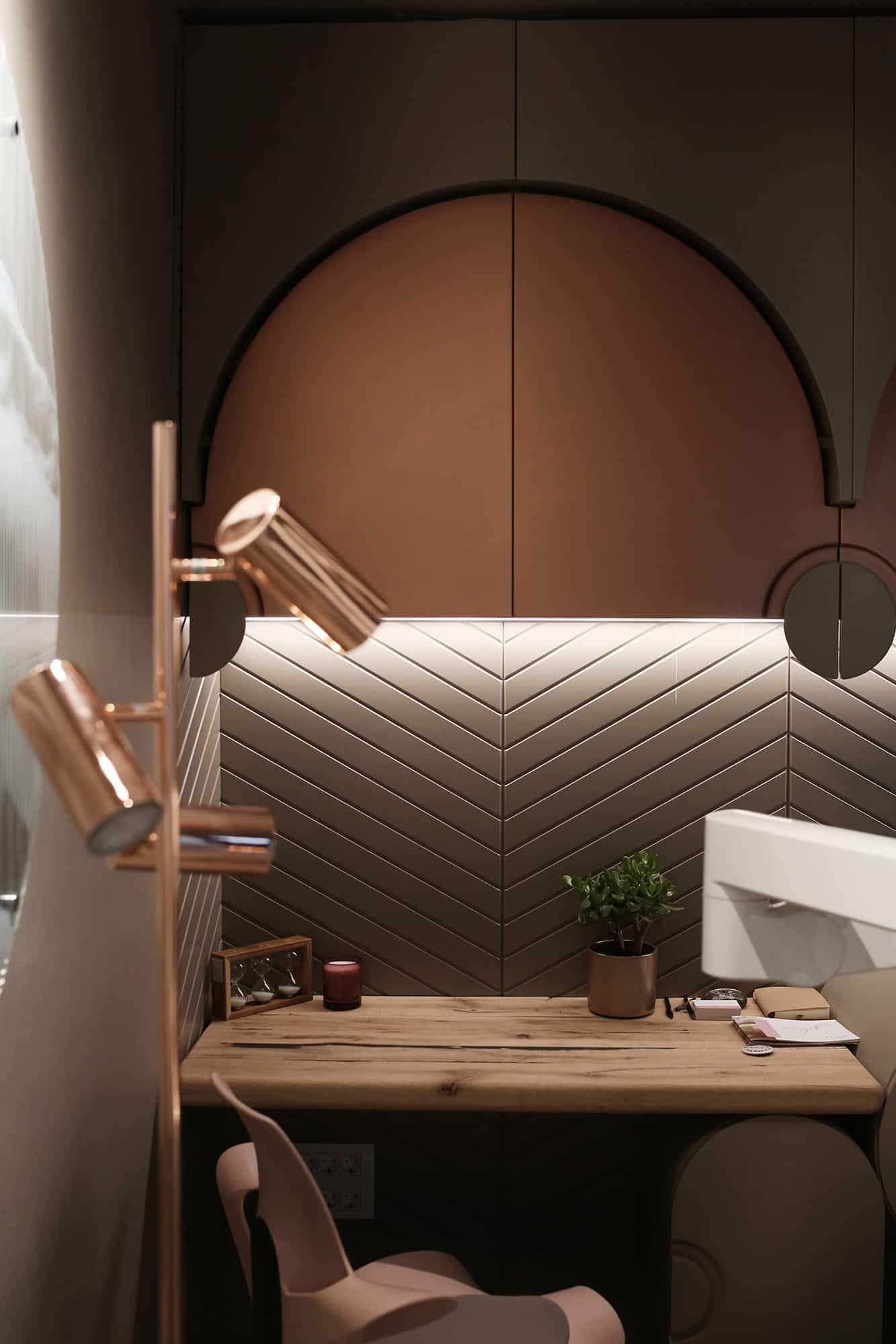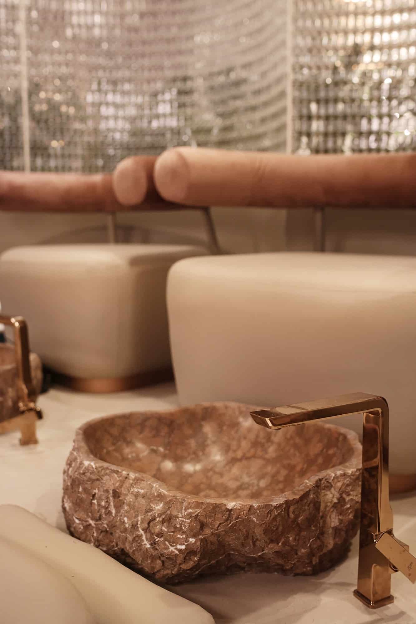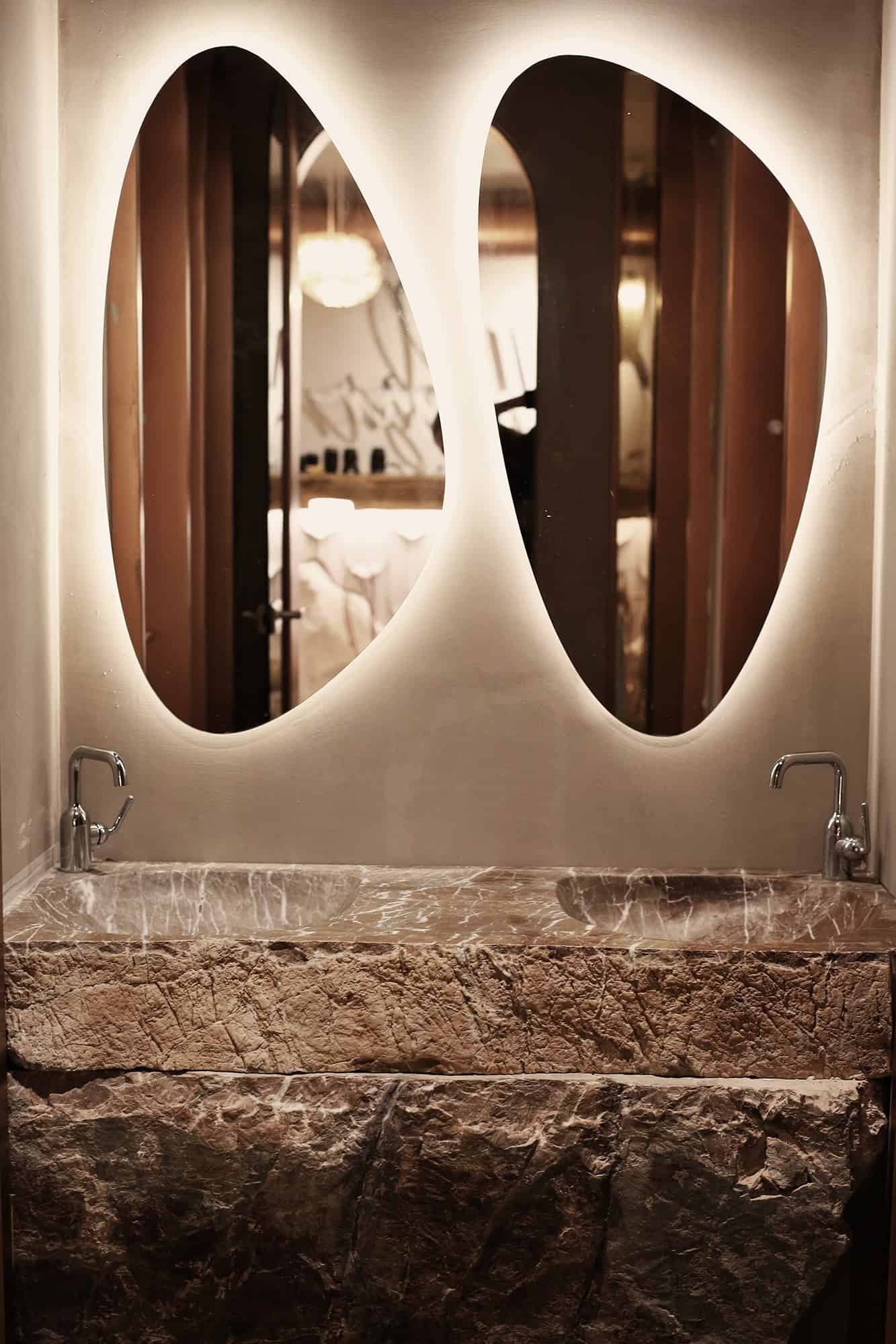 Paleta e përzgjedhur e ngjyrave dhe e dritave krijon një ambient të ndriçuar dhe të butë. Elemente të drurit dhe gurit të pa përpunuar janë përfshirë në dizajn. Ato janë përdorur për të krijuar tavolinën në hyrje të sallonit e cila shërben si recepsion si dhe bazën për ulëset e kristalta.