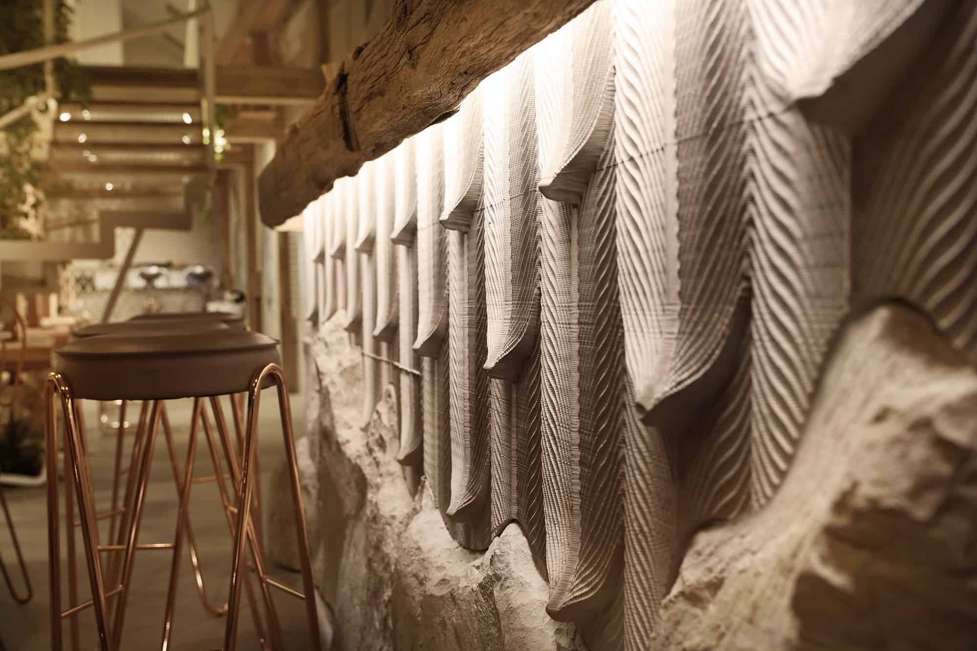 Ndër shumë elemente të veçanta brenda hapësirës, është edhe muri ndarës i zonës së pedikyrit, i cili është i ndërtuar nga përafërsisht 4 mijë shishe boshe të llakave për thonj të cilat janë renditur në një formë të lakuar, pas së cilit ndodhen lavamanët prej guri të punuar me dorë.
