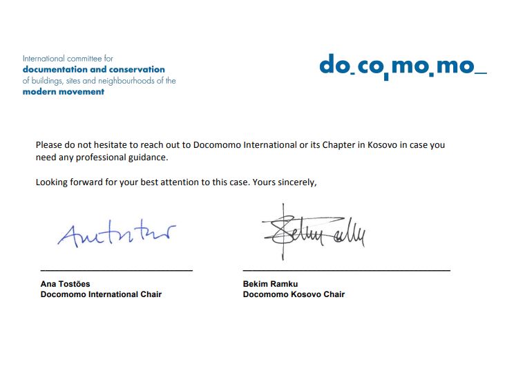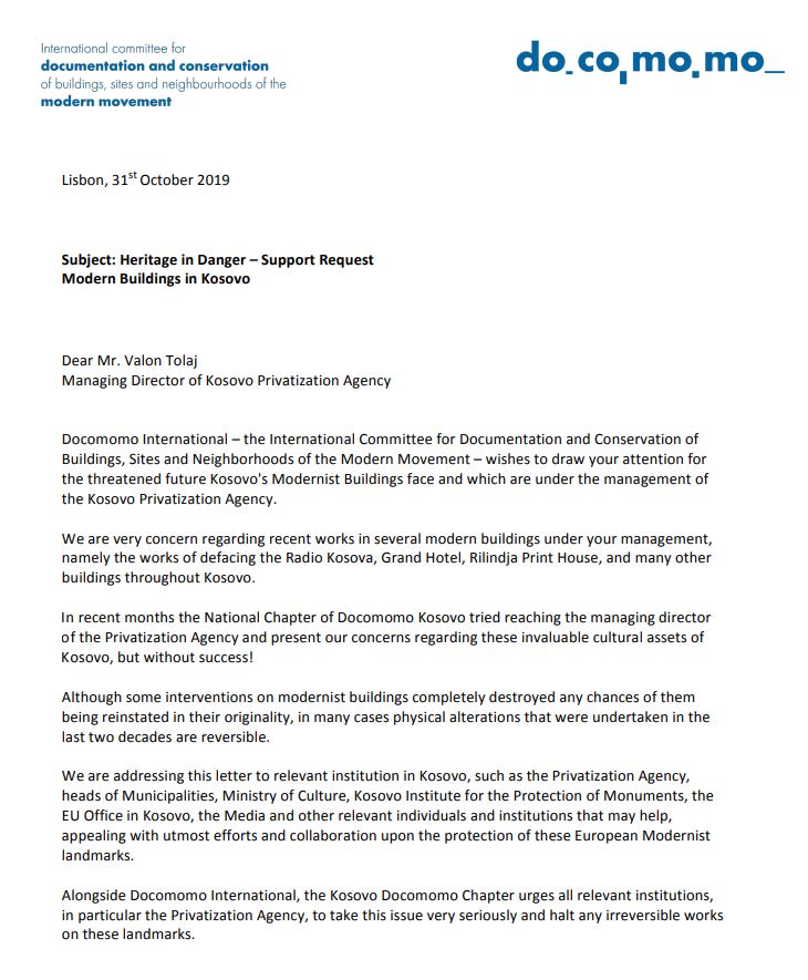 “DoCoMoMo Interational – Komiteti ndërkombëtar për dokumentimin dhe konservimin e ndërtesave, tokave dhe lagjeve të lëvizjes moderne, dëshiron të tërheq vëmendjen tuaj ardhmërinë e kërcënuar të Ndërtesave Moderniste të Kosovës dhe që janë nën administrimin e Agjencisë Kosovare të Privatizimit.