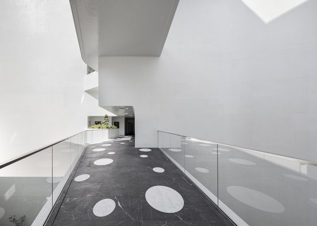 Fasada spektakolare luan me dritë për të lartësuar “aspektin skulpturor urban” të ndërtesës, i cili u bë i mundur nga shirita të bardhë që e mbulojnë dhe mbrojnë atë.
