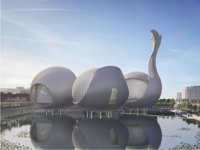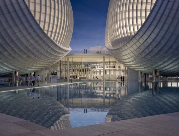 E vendosur në zonën e reflektimit, ajo është e mbyllur me xham dhe rrethohet me ujë nga të gjitha anët, me pamje deri në sallat e adhurimit. Çatia e qendrës formon sheshin lart, duke siguruar një rreze drite të sheshtë.
