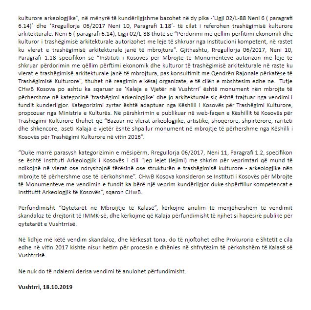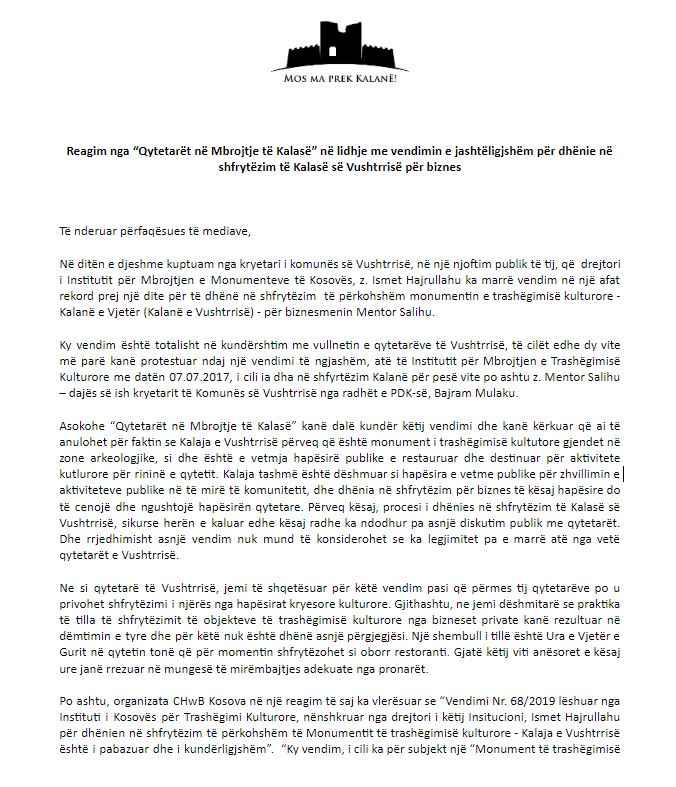 Edhe Grupi “Qytetarët në Mbrojtje të Kalasë” në lidhje me vendimin e Institutit për Mbrojtje të Monumenteve të cilët kanë vendosur që Kalaja e Vjetër të Vushtrri të jepet në shfrytëzim për qëllime biznesore ku aty do të ketë një restorant.