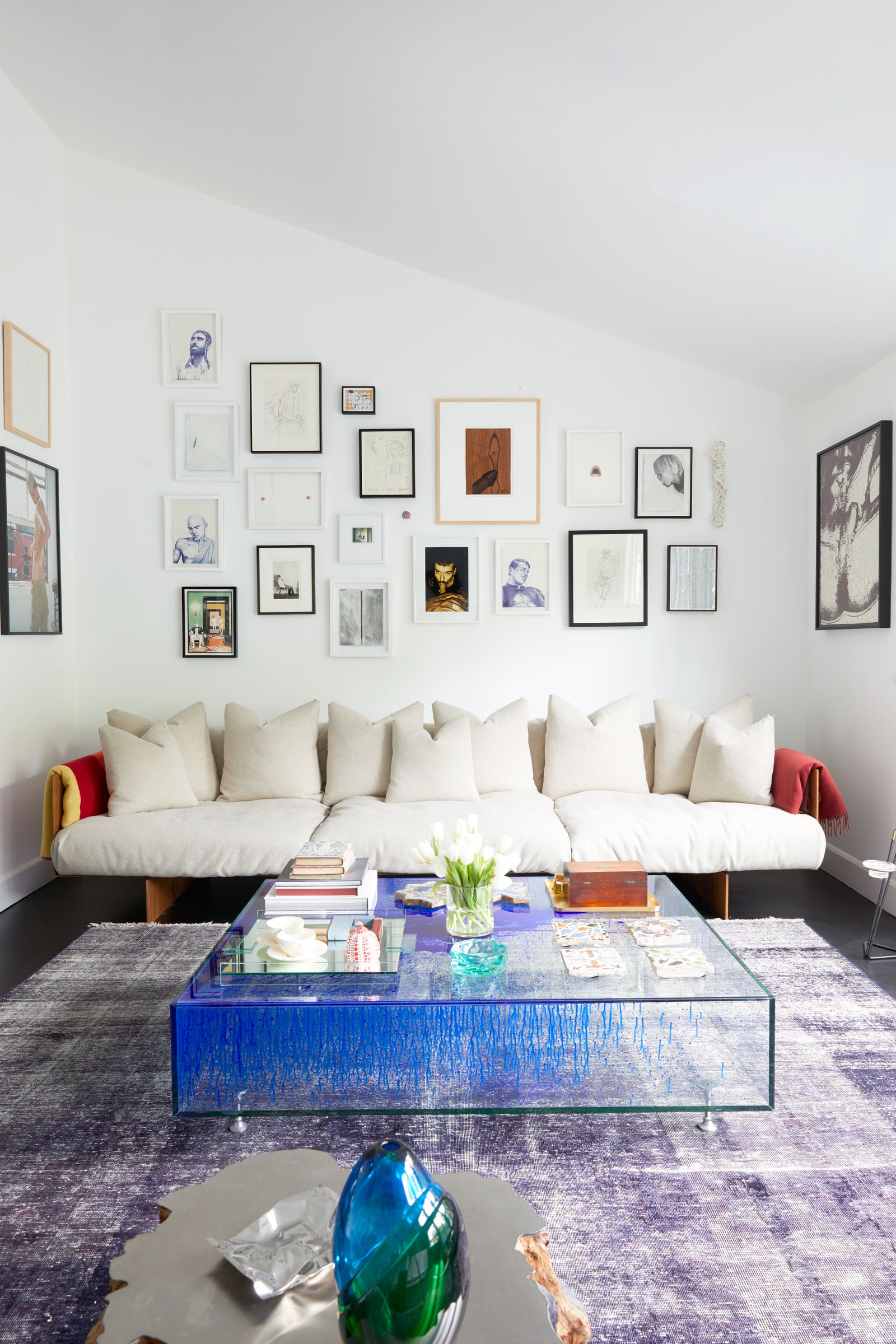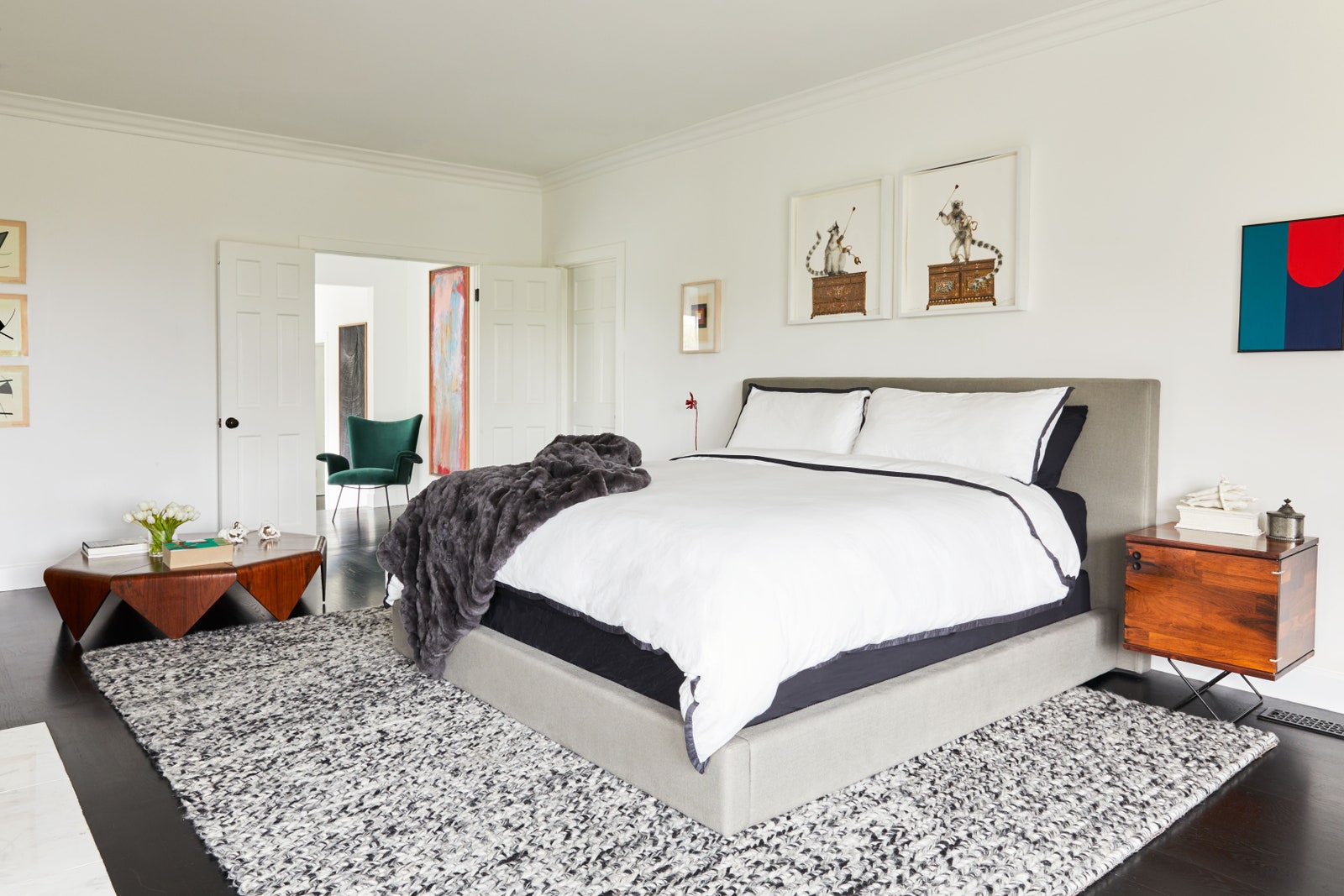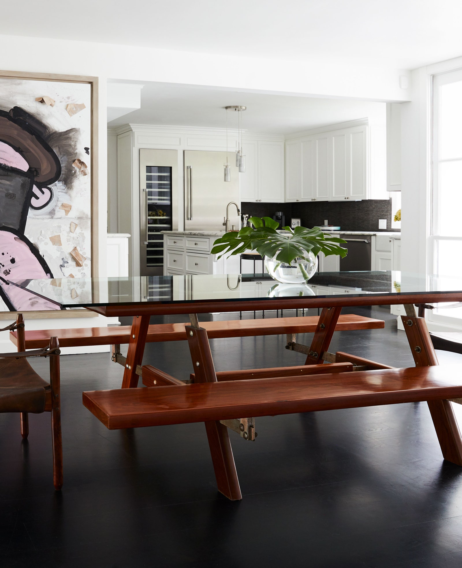 Kontrastet e personalitetit të çiftit shtrihen në ndjeshmërinë e tyre të dizajnit: Njëri është një minimalistë dhe tjetri një maksimiste. E megjithatë, në procesin e zhvendosjes në shtëpinë e tyre të Hollivudit në Perëndim, një vendbanim kodrinor i viteve 1930, i rrethuar nga gjelbërimi, ata ishin në gjendje të gjenin një mes të lumtur, duke ndikuar në njëri-tjetrin në mënyra delikate dhe jo aq të holla. Steele, një koleksionist i dashuruar pas artit, ka zhvilluar një vlerësim më të madh për veprat abstrakte (sesa ato figurative), të cilat plotësojnë orenditë moderniste të De Santi nga Brazili. Dhe De Santi, deri në një moment, është bërë më tolerante ndaj teprimeve dekorative. “Burri im është një koleksionist me zemër – ai vazhdon të blejë qeramikë, zbukurime dhe vepra arti, dhe i pëlqen të shfaqë të gjitha këto gjëra,” thotë ai. “Unë i dua ata gjithashtu, por pasioni im më i madh është dizajni dhe preferoj t’i tregoj pjesët e mia sa më pastër të jetë e mundur.”