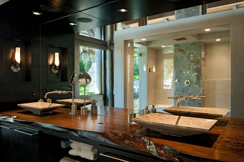 Nëse kërkoni që ta fisnikëroni hapësirën e banjës dhe të fusni frymë sharmante rustike në enterierin modern, mjafton ta zëvendësoni vetëm një element banje dhe në vend të komodinës moderne për lavabo të zgjidhni pllakën nga druri i papërpunuar
